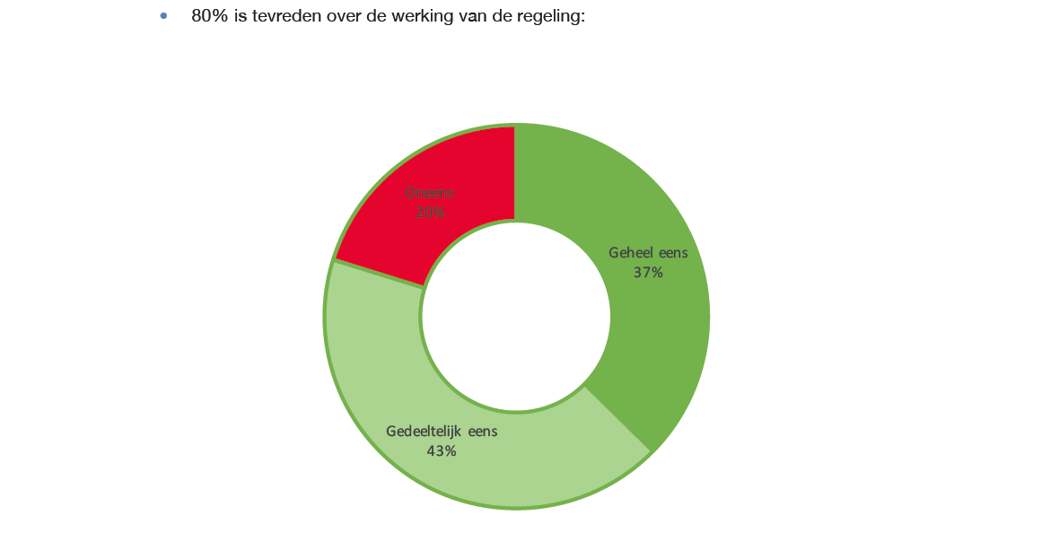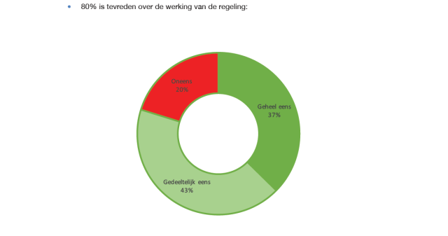 Terwijl in werkelijkheid een substantieel deel van de ondervraagden twijfels heeft over de manier waarop de regeling wordt uitgevoerd. Wanneer je de ondervraagden optelt die Gedeeltelijk eens invulden, bij de mensen die het regelrecht Oneens waren met de stelling, dan kom dat bijna op de helft van de ondervraagden. Een serieus te nemen percentage dat aangeeft niet helemaal tevreden te zijn over de regeling en aanleiding geeft om te kijken of de regeling moet worden aangepast.