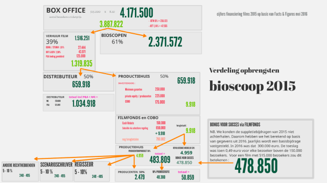 Wanneer er 515.000 bezoekers naar de film gaan, levert dat een boxoffice van meer dan 4 miljoen. Hiervan houdt de bioscoop 2.3 miljoen in. De distributeur ontvangt  in totaal net iets meer dan 1 miljoen euro (incl. P&A en MG), de producent (dankzij bonus voor succes via het Filmfonds) iets meer dan 50.000. De producent ontvangt namelijk via het Filmfonds een bedrag (in ons voorbeeld 478.850 euro) om te besteden aan een nieuwe film. Hiervan ontvangt hij een producersfee. (NB de zogenaamde bonus regeling is in 2018 afgeschaft)