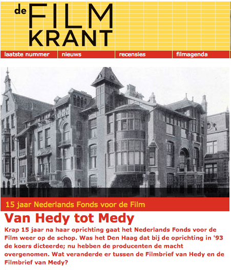 Veel van de ideeën uit begin jaren ’90 die niet direct gestalte krijgen, komen in de loop der jaren tot stand: de ‘filmstudio’ wordt in ’95 het Binger Instituut, de fiscale regeling komt er in ’98 (Note : de CV regeling), en het Filmfonds haalt in 2003 de succesbonus van de plank. Deze zomer tenslotte krijgt het matching fund (Note de Suppletieregeling) gestalte als opvolger van de cv-regeling. De hand van Hedy als architect van Nederland filmland is anno 2007 nog altijd voelbaar.”