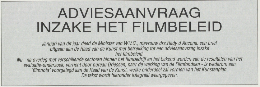 ‘Wanneer de overheid de Nederlandse film bestaanszekerheid wil geven, dan moet zij haar beleid zodanig inrichten dat de Nederlandse filmer en de Nederlandse filmproductie voldoende mogelijkheden geboden worden om zich te ontplooien. Daarbij is de taak van de overheid samen met de privésector niet alleen het bestaande publiek uit te breiden, maar vooral de rest, het niet-publiek, naar zich toe te trekken.