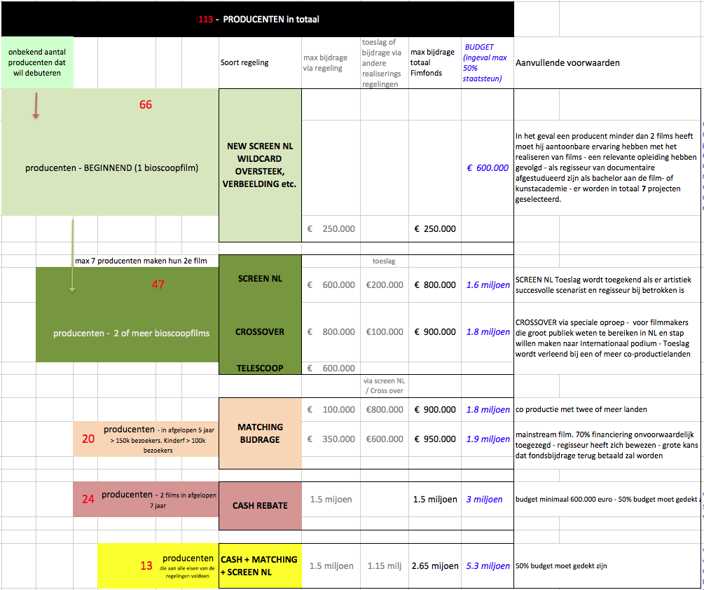 Een gewone NL PRODUCENT (2 of meer bioscoopfilms) kan maximaal 600.000 euro aanvragen (excl. toeslagen voor sales etc). Op dit moment zijn er zo’n 46 ‘gewone’ producenten.