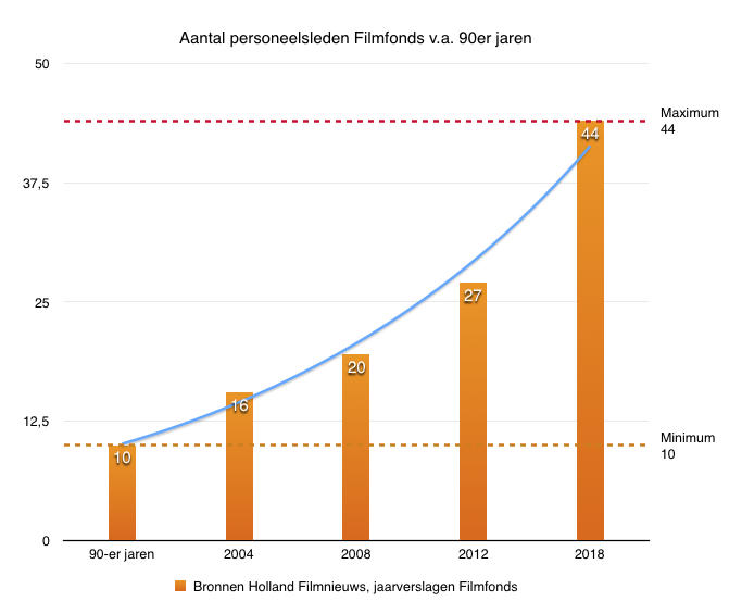 De inhoudelijke en zakelijke controle die het fonds uitvoert is waarschijnlijk een belangrijke reden voor het stijgen van het aantal mensen dat betrokken is bij de uitvoering van filmbeleid. Dat aantal is sinds 2004 meer dan verdubbeld van 20 naar 44 medewerkers in 2018.