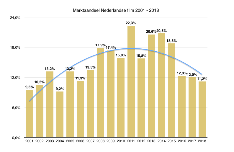 Het is niet eenvoudig om aan te geven wat de samenleving terugkrijgt voor het beschikbaar gestelde geld. Het marktaandeel van de Nederlandse film is een graadmeter, het drukt uit hoe vaak mensen voor een Nederlandse film kiezen wanneer ze naar de bioscoop gaan. Door de jaren heen blijkt dat het publiek wisselend kiest voor een Nederlandse film. Gemiddeld genomen is het sinds 2000 12%. Dat is een stuk meer dan het in de beginperiode was en ook meer dan in de jaren negentig, toen daalde het marktaandeel namelijk tot rond de 1%. Helaas is het marktaandeel in 2016 gedaald naar het niveau van tien jaar geleden en is het daarna elk jaar een stukje verder gezakt.