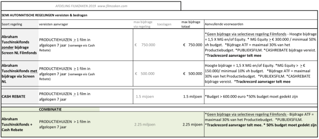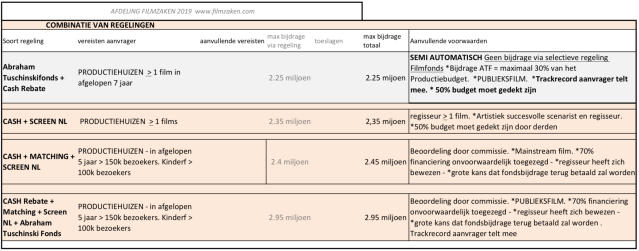 Aangezien het niet eenvoudig is om marktfinanciering te vinden en filmmakers met hun producenten hun films het liefst maken voor het budget dat nodig is, zullen producenten naast de CASH REBATE regeling (i.e. Netherlands Film Producten Incentive) ook gebruik willen maken van de andere regelingen zoals SCREEN NL en de MATCHING REGELING.
